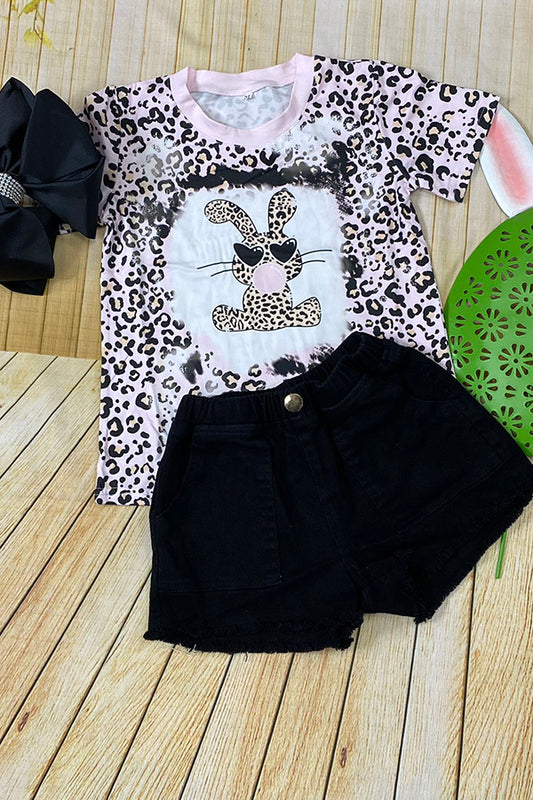 SaleDLH2769 Leopard bunny printed top & black denim shorts 2pc girls sets