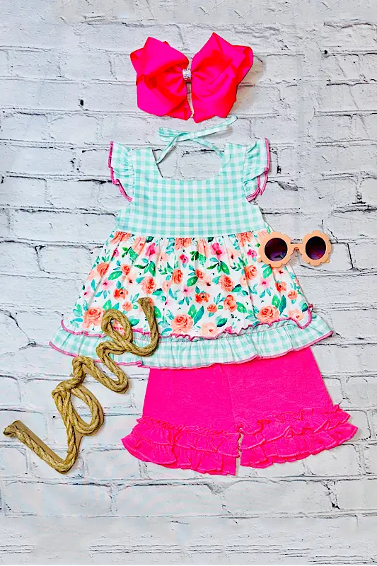 SaleFloral & checker print aqua ruffle 2pc girls sets XCH0666-35