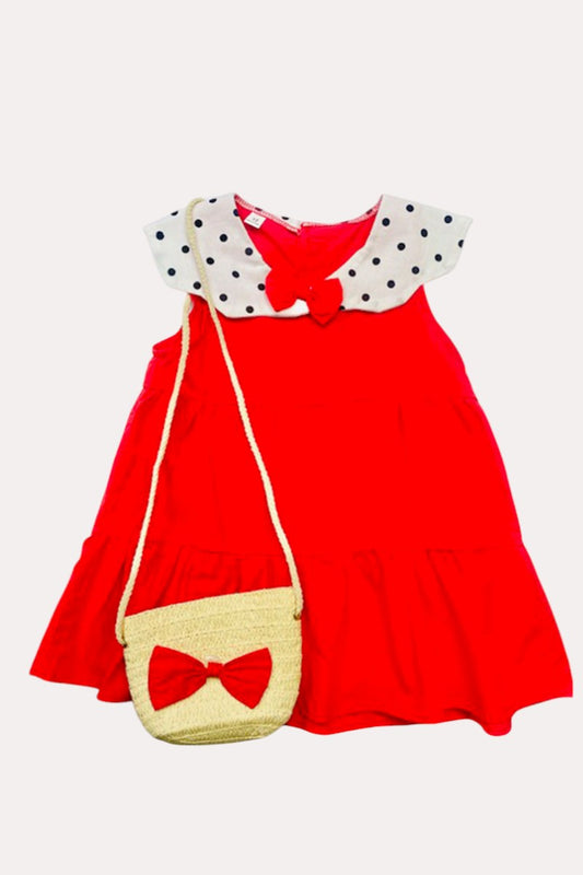 Sale241126M White dot red baby doll todder girls dress w/straw bag