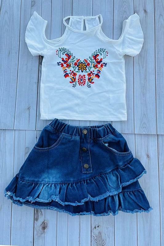 SaleCold shoulder sleeves floral printed white top & denim skirt 2pc girls set 251294M