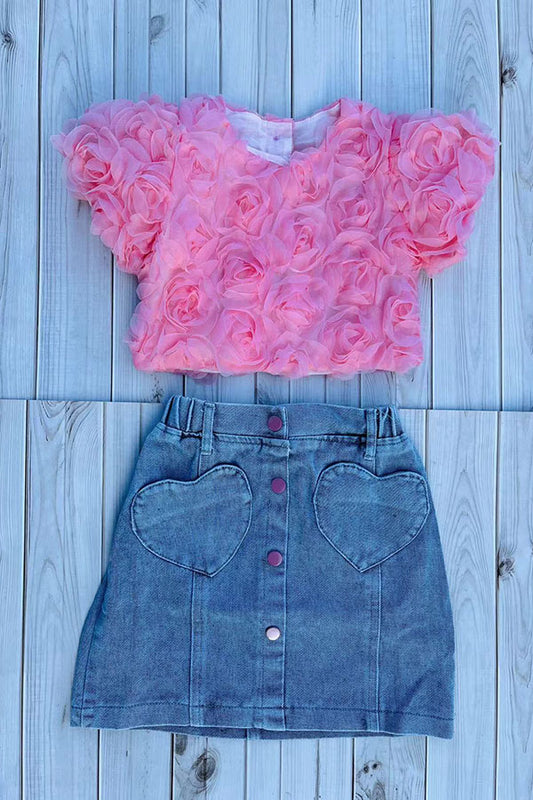 SalePink rose cropped top & denim skirt with heart pockets 2pc girls set 251296M