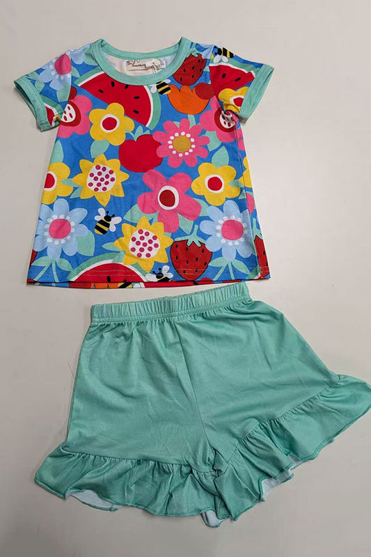 SaleSummer flower & watermelon printed top & mint shorts 2pc girls set XCH04011