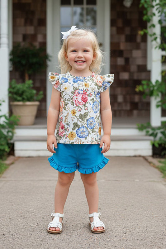 SaleFloral flutter sleeve top & blue shorts 2pc girls sets DLH1215-13