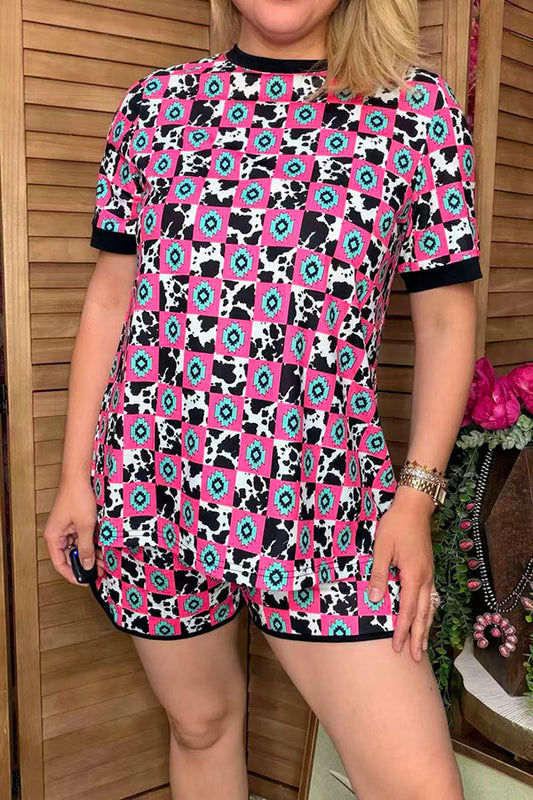 SalePink checkered printed long sleeve top & shorts 2pc girls sets XCH04051