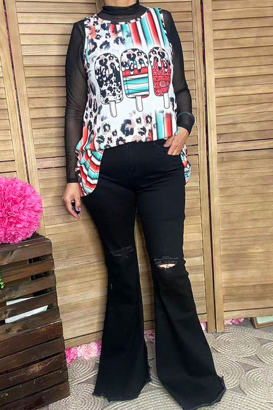 SaleLeopard printed blue denim bell bottom girl jeans DLH2522