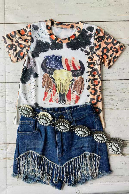 SaleBull skull on a USA flag animal print short sleeve t-shirt DLH1108-12