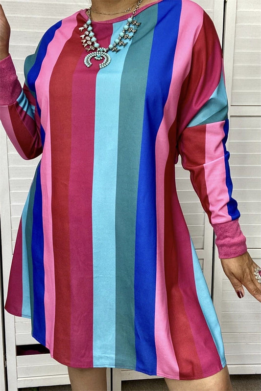 SaleBQ6972 Multi-color striped long sleeve women dress w/waist band