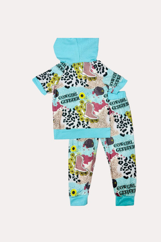 Sale"Cowgirl Glitter" boots and sunflower print short sleeve hoodie 2pc set D0923-20
