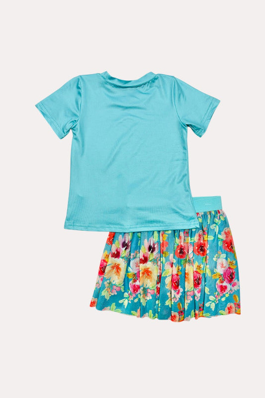 D2784 Aqua short sleeve top & floral mesh skirt 2pc girls summer sets