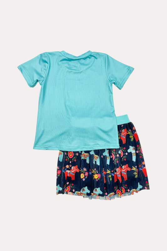 D2788 Aqua short sleeve top western horse navy mesh skirt summer girls sets
