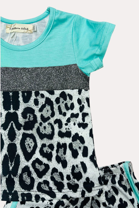 X0666-29 Mint & Grey & Leopard top & leopard trim shorts 2pc girls sets