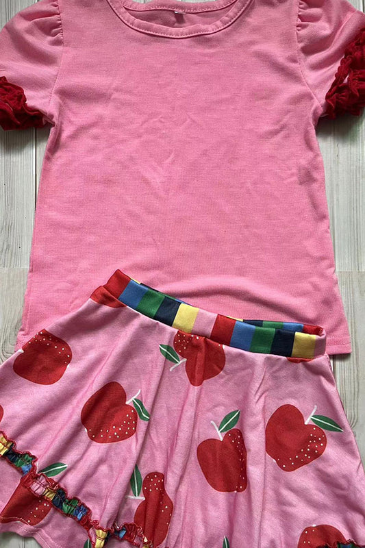 Back to school pink short sleeve top & apples printed skirt 2pcs girls sets wholesale D2850