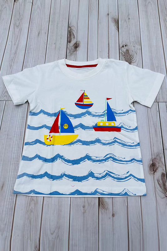 SaleSailboats & blue ocean waves print white short sleeve boy t-shirt 2601029M