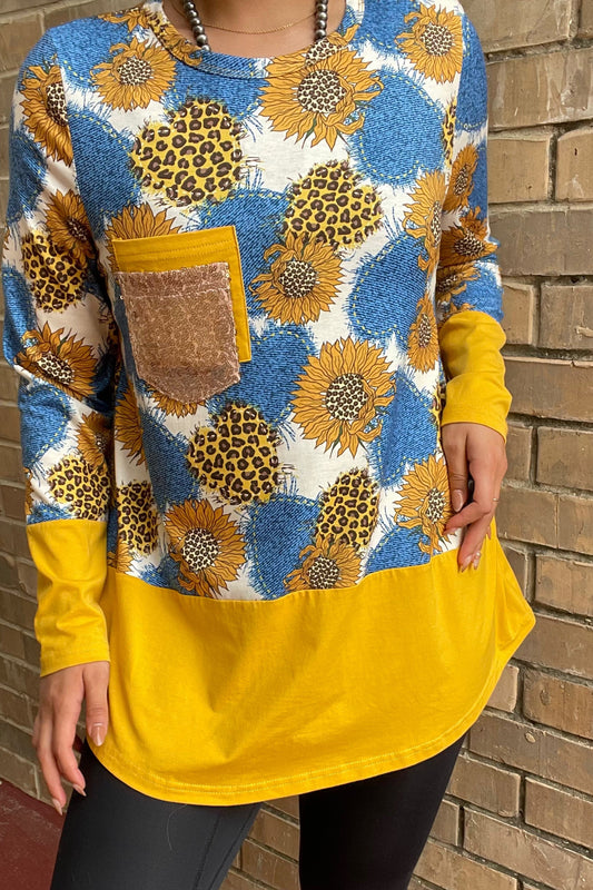 XCH10344 Blue & yellow sunflower printed long sleeve top w/sequin pocket