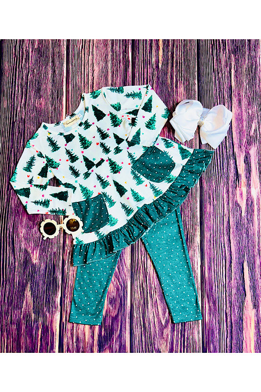 Hunter green trees & polka dots 2pc ruffle set XCH0015-24H