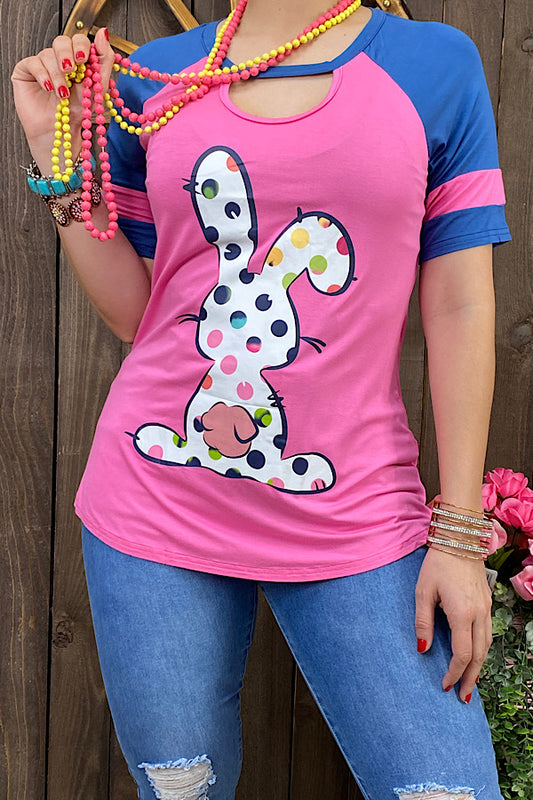 SaleDLH10751 Pink/blue key whole neckline top w/polka dot bunny print