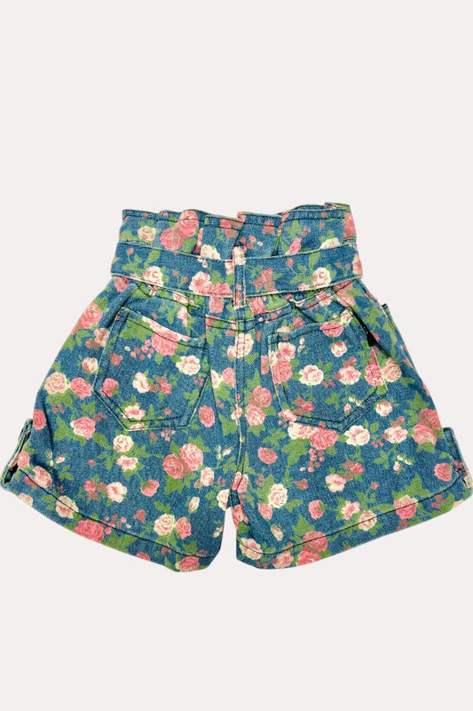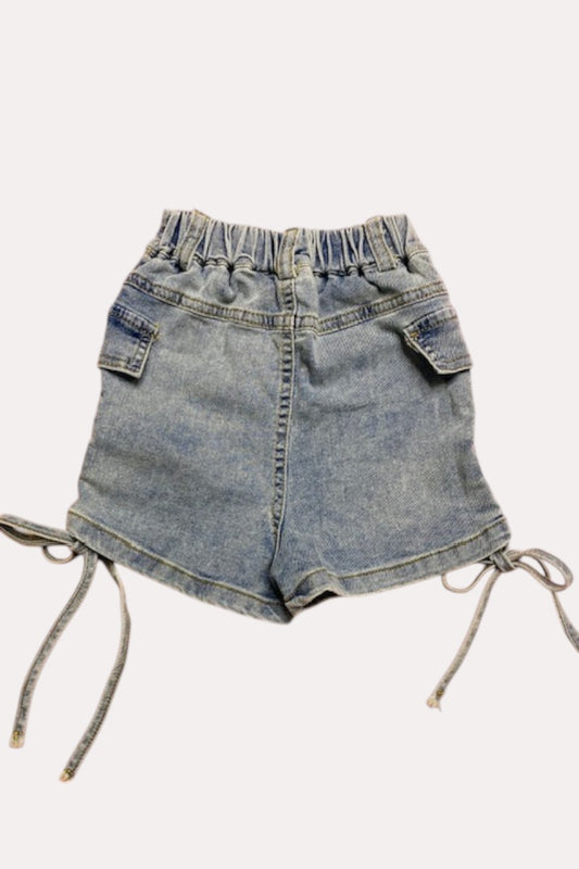 230119M Washed denim blue side tied bow & buttons girls shorts