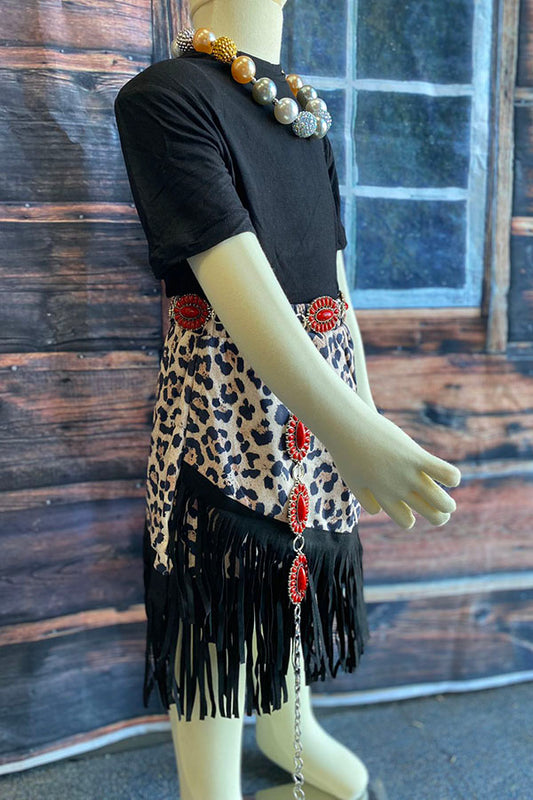 XCH04004 Black short sleeve top suede leopard skirts with fringe 2pcs girls sets