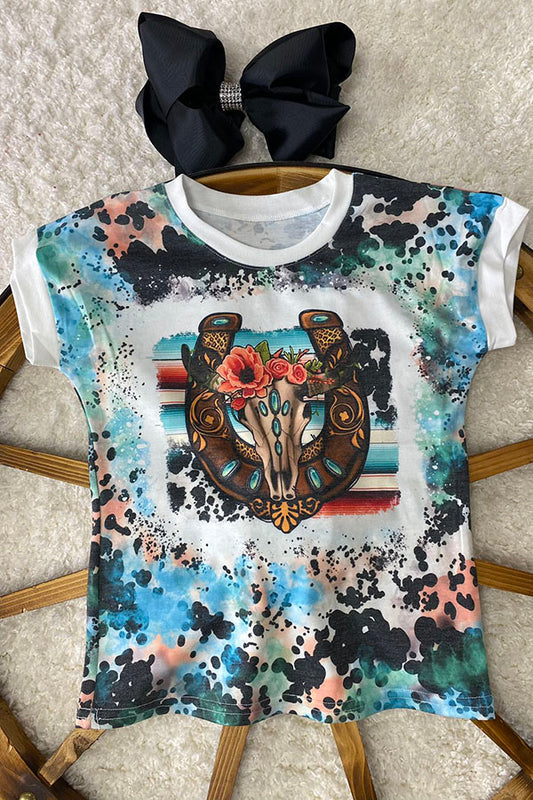 Cow skull w/flowers on a horseshoe bleached short sleeve top DLH0824-1
