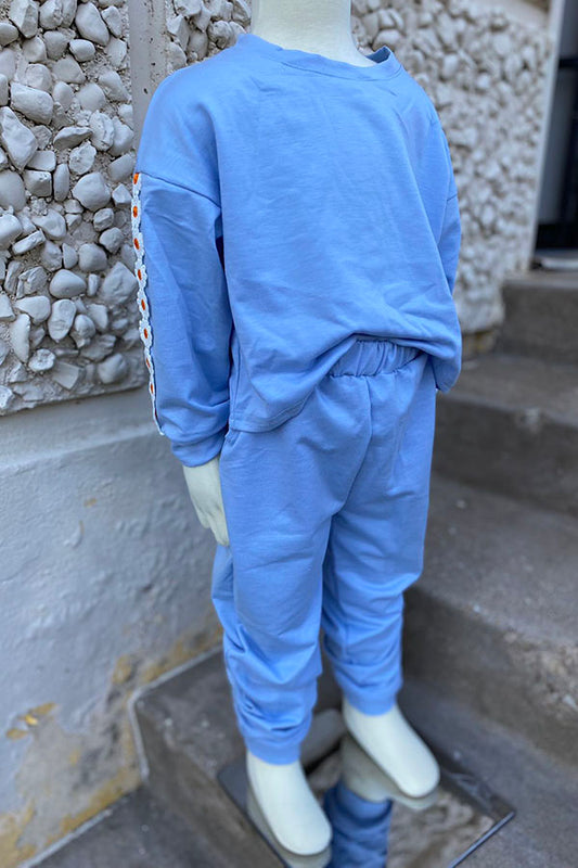 DLH2815 Blue long sleeve pullover shirt & pant 2pcs girls clothing sets w/daisy embroidery