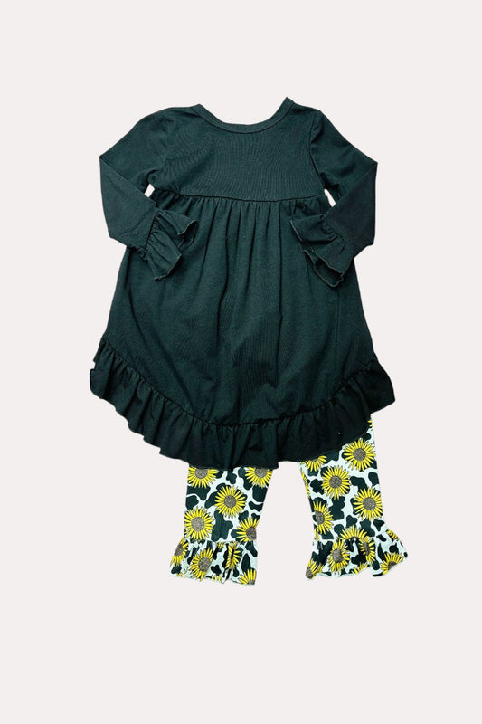 D2539 Black high low top & sunflower & cow ruffle legging girls sets
