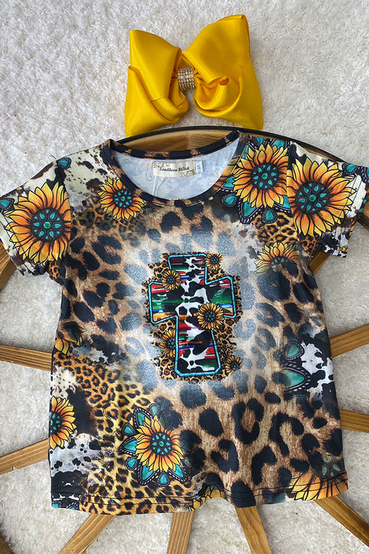 Western Leopard & sunflowers w/cross short sleeve girls t-shirt X0722-24