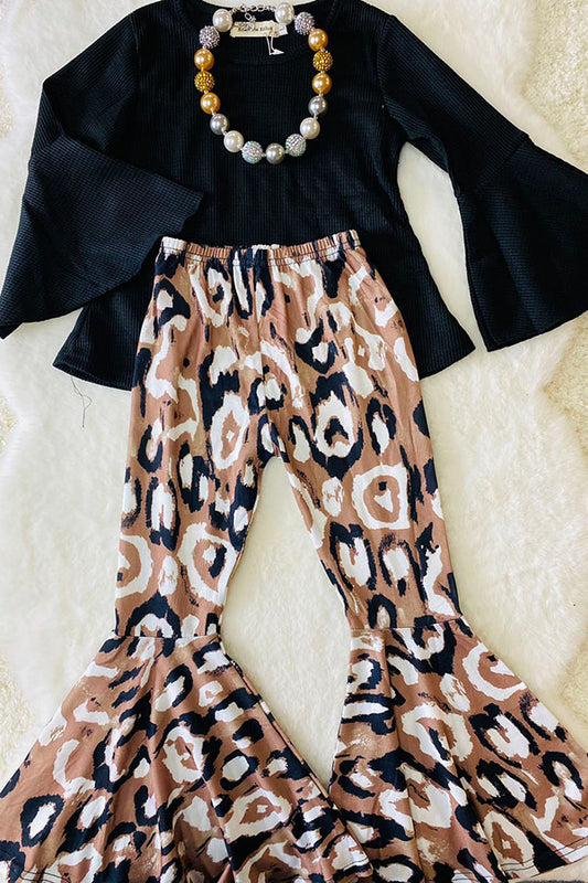 XCH0024-10H Black knit ruffle long sleeve top bell bottom pant girls outfit sets