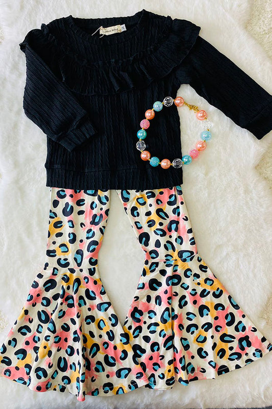 XCH0024-1H Wholesale black ruffle top colorful leopard pant girls clothing sets