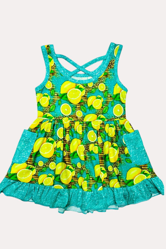 SaleX0888-8 Turquoise yellow lemons printed girl dress w/pockets