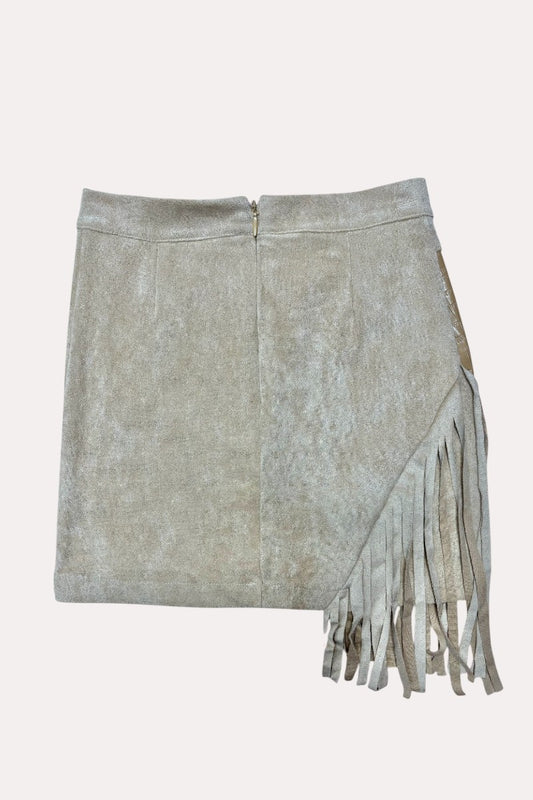 D2566 Beige fringe trim asymetrical hem faux suede girls skirt