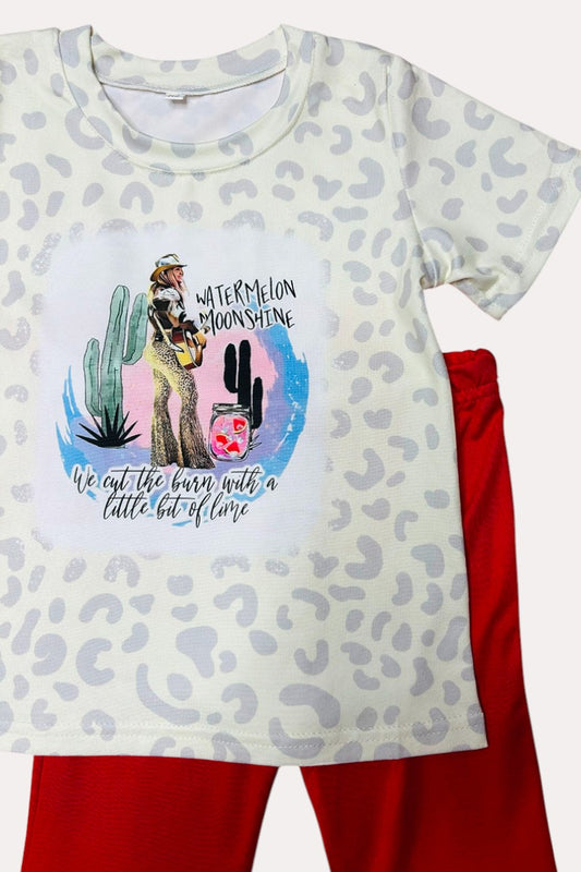 SaleD2750 Leopard printed short sleeve top & red bell bottom 2pc girls sets