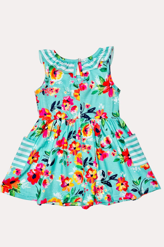 SaleX0888-14 Green multicolor floral print w/stripped pockets girls dress