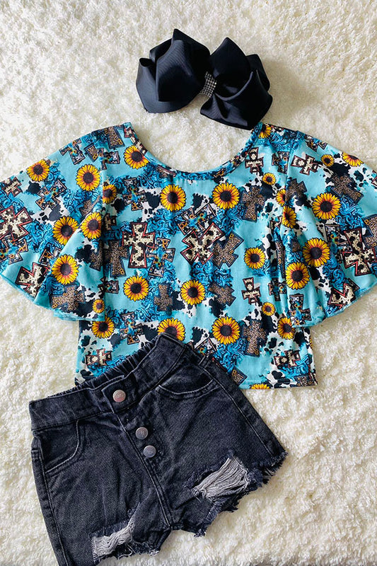 Crosses & sunflowers turquoise short bell sleeve DLH1124-4