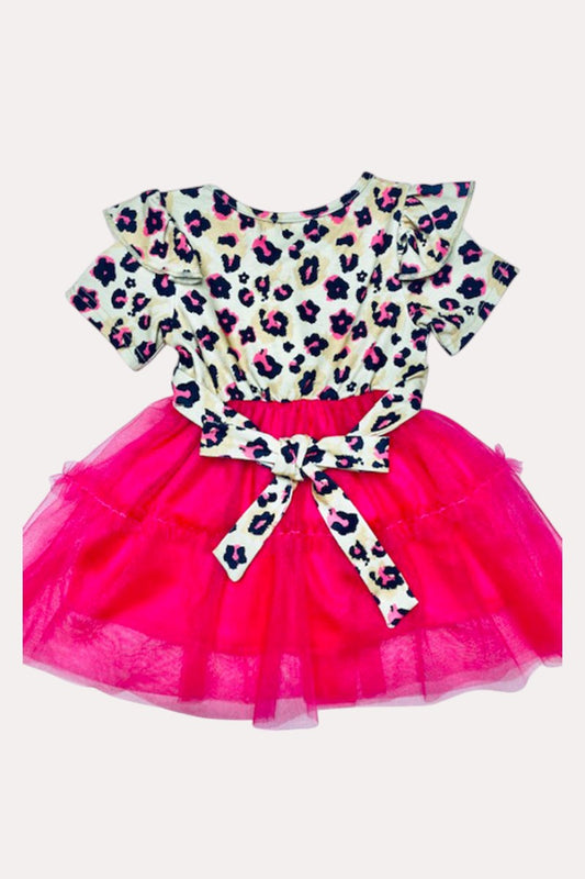 SaleX0017-17 Leopard & hot pink chiffon swirl girls dress with belt