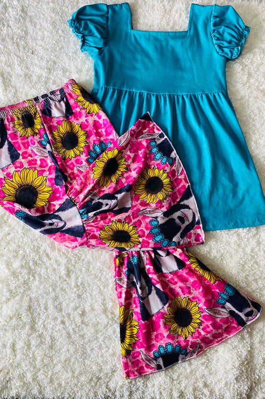 Pink cheetah, goats, & sunflowers w/turquoise top 2pc set 1114WY