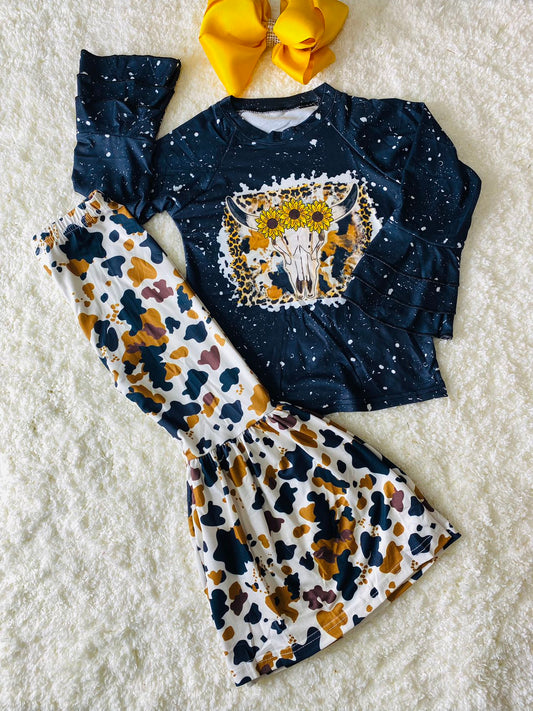 Black cow skull head with sunflowers black 2pc long sleeve set DLH0824-8