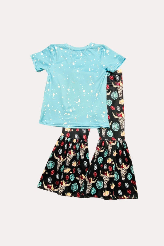 X0333-8 Bull prints blue top & Aztec trim shorts 2pc girls outfit sets