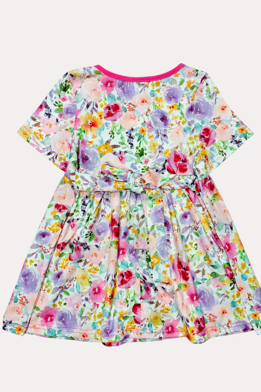 X0888-3 Multi color floral printed short sleeve girl dress w/side belt.