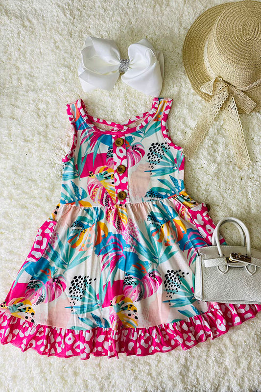 SaleXCH0888-10H Floral print sleeveless girls dress with pink leopard pockets