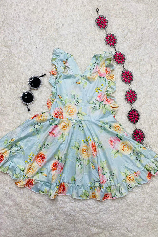 SaleDLH2364 Summer floral prints blue girls swirl dress