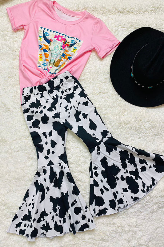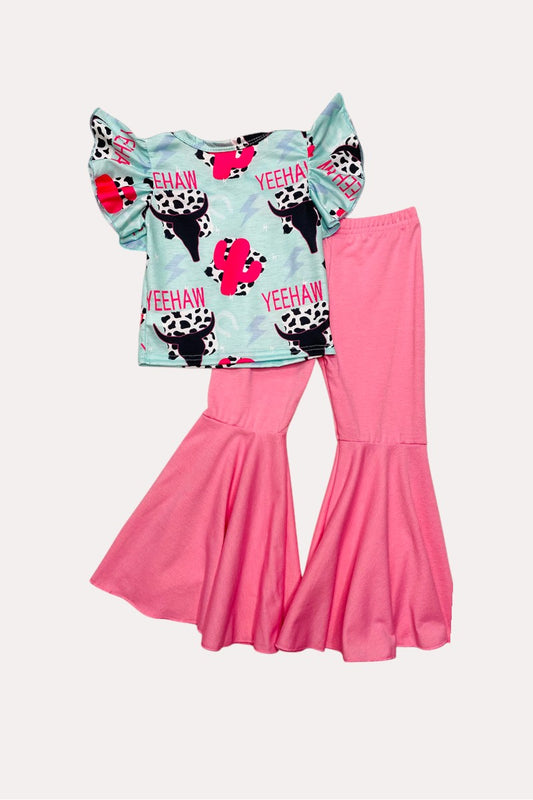 D2384 "YEEHAW" cactus & bull skull top pink pant 2pc girls set