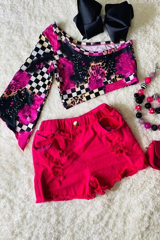 D1230-05 Leopard short sleeve top & pink denim shorts 2pc girls sets