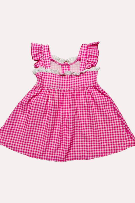 SaleX0555-10 Pink checkered & lace &v pockets summer girls dress