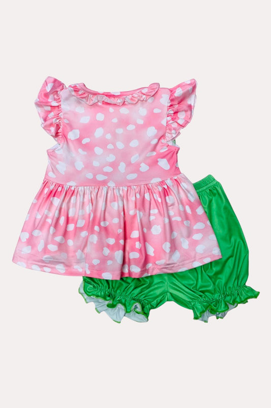 Pink cactus embroidery detail top w/green shorts 2pcs girl set D2507