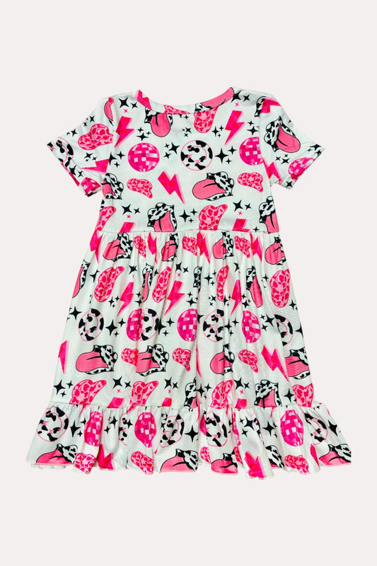 SaleD1215-02 Pink, white, & black multiple retro prints short sleeve swirl dress