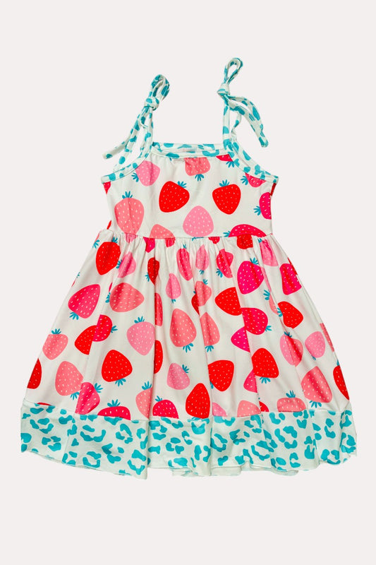 D2431 Pink strawberry printed w/turquoise leopard trim girls dress