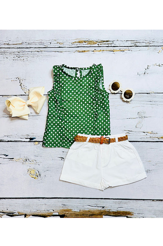 SaleGreen w/white polka dots top w/white shorts & brown belt 3pc set DLH2349
