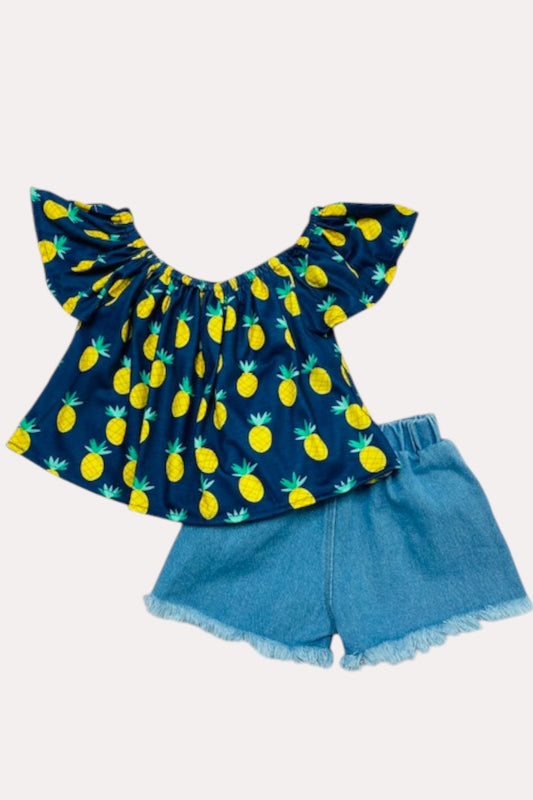 Navy & yellow pineapples off the shoulder top w/denim shorts 2pc set D2360