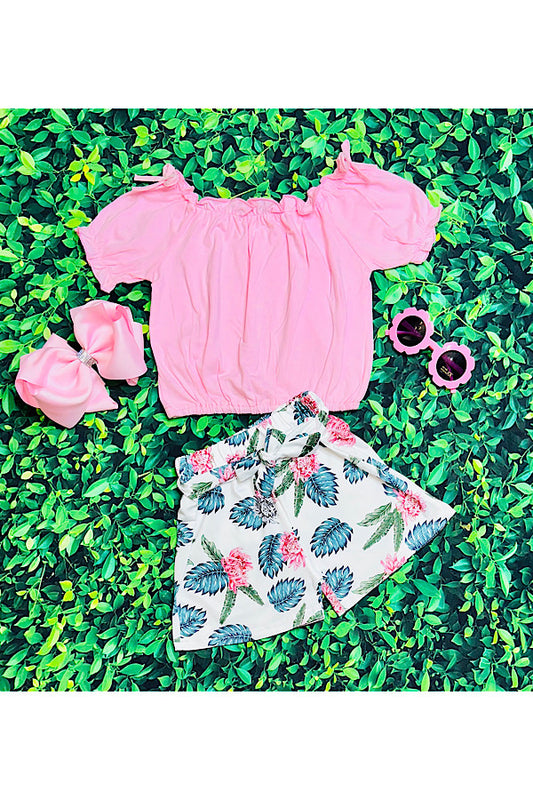 Pink off the shoulder top w/floral print shorts 2pc set 230126M