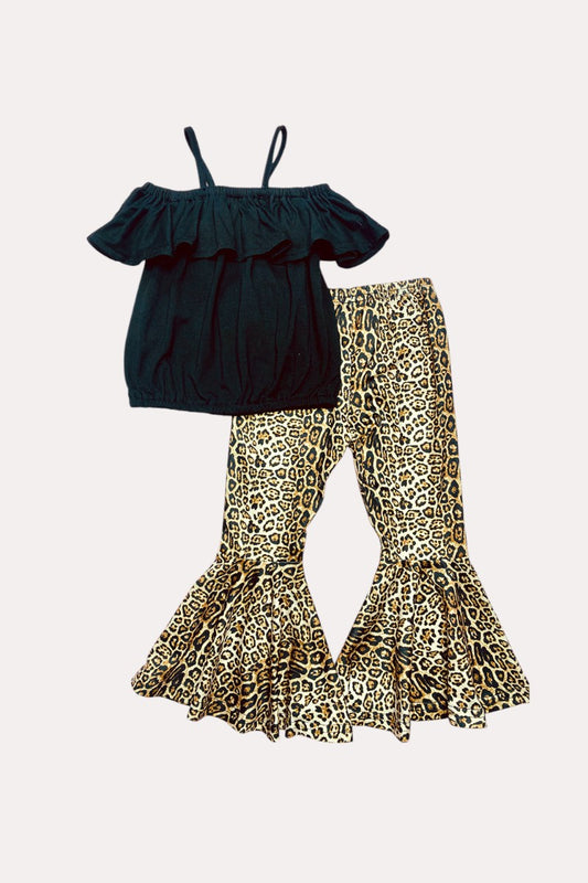 X0777-35 Black off the shoulder top w/jaguar print bell bottoms 2pc girls sets